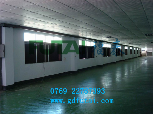 解決方案二:像這類車間用負壓水簾風(fēng)機降溫效果很好的,可以調(diào)節(jié)室內(nèi)干燥導(dǎo)致的線絨到處飛舞,增加室內(nèi)濕度更有利于車間環(huán)境的改善,另一面墻上安裝的水簾有很多小孔,室外空氣在大氣壓下自動流入室內(nèi)。因此空氣不斷與室外循環(huán)。如果安裝的合適,室內(nèi)的所有空氣都會參與這個大循環(huán)。因此對于污濁、煙霧、灰塵、異味的房間而言,這種通風(fēng)模式最徹底??紤]到投入成本,有些客戶會僅僅選擇負壓風(fēng)機,而不安裝降溫水簾。此時風(fēng)機對面的空氣經(jīng)過門和窗戶進入,沒有降溫處理。室內(nèi)空氣流動也會有較好的降溫效果。