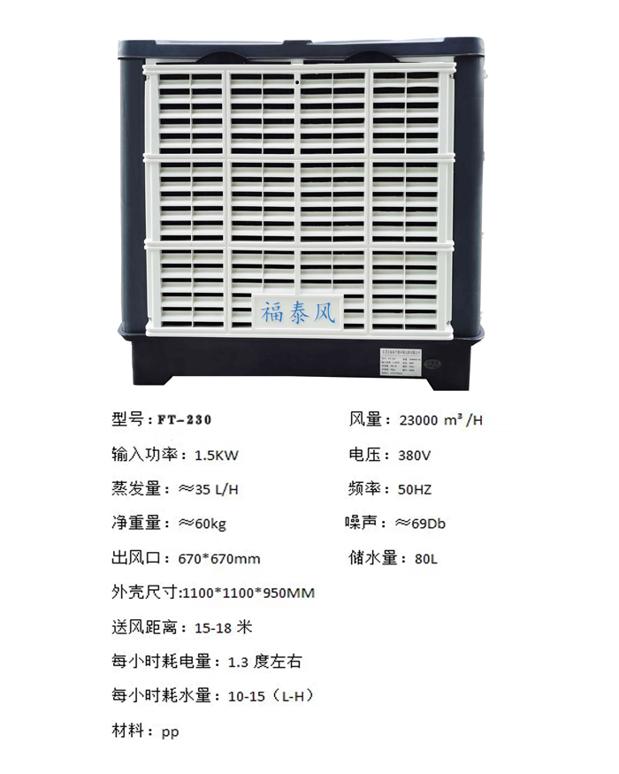 福泰環(huán)保空調(diào)性能穩(wěn)定在越炎熱的天氣下降溫的效果越好。適用于開敞式及半開敞式環(huán)境,能夠直接輸送自然風(fēng)及輸送降溫后的涼風(fēng)。室外新鮮空氣經(jīng)福泰蒸發(fā)式冷氣機(jī)過濾、降溫后向室內(nèi)源源不斷的大量輸送,將室內(nèi)帶有異味、粉塵和混濁悶熱的空氣排出室外,同時兼顧換氣降溫及增加空氣含氧量等多種效果。