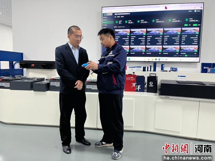 圖為技術(shù)人員向銀行工作人員介紹電池產(chǎn)品。李海珠 攝
