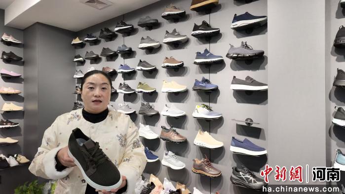 圖為保書公司總經(jīng)理代瑞利展示鞋品。王佳寧 攝